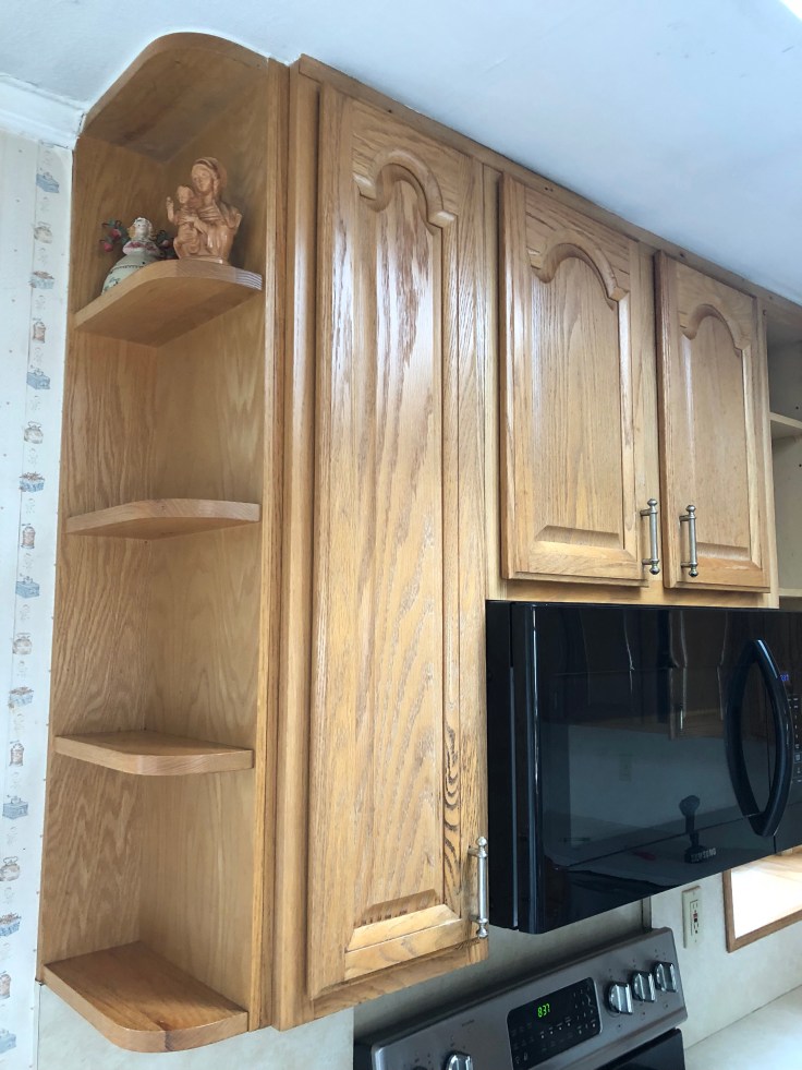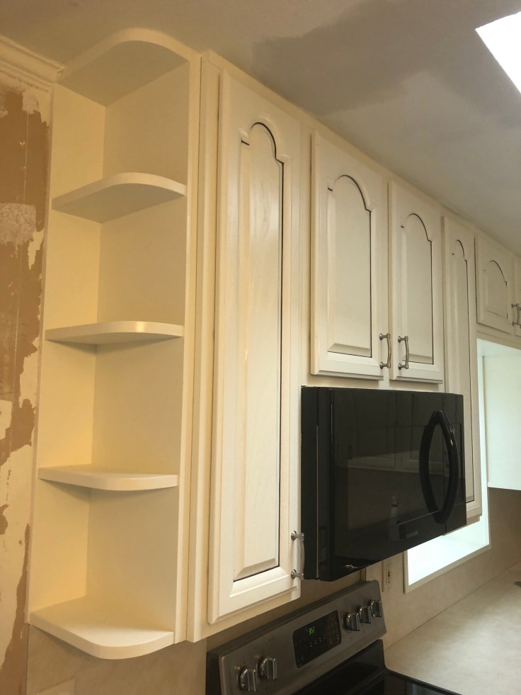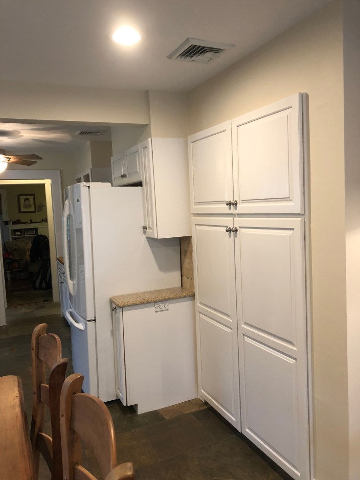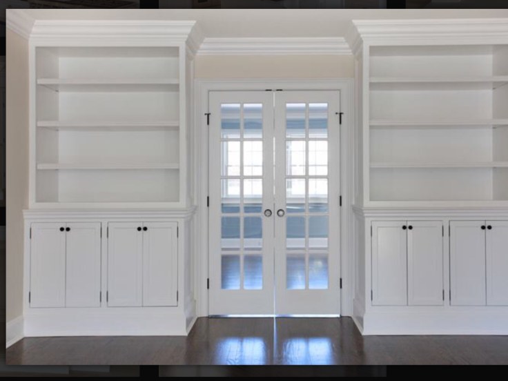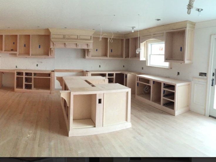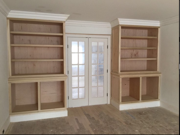 Custom Bookcases & Kitchen Cabinets Built on site & spray painted